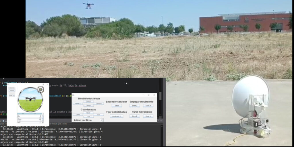 Este trabajo desarrolla una sistema de seguimiento de una antena que permite la comunicación con el dron hasta 50 Km. La antena se orienta automáticamente con el dron para permitir una comunicación estable en todo momento. El sistema permite mantener la alineación óptima entre la antena y el vehículo en movimiento, maximizando la calidad de la señal y minimizando las pérdidas de comunicación.